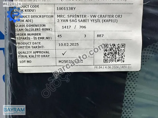 Mercedes Sprinter 2020-2024 modelleri için kapı camları arayan kullanıcılar için bu parça sıfır olarak listelenmektedir. Çıkma parçalar, sıfır parçalara göre daha uygun fiyatlı olup orijinal üretici kalitesini korur. İstanbul adresinde bulunan satıcıdan temin edilebilir.
