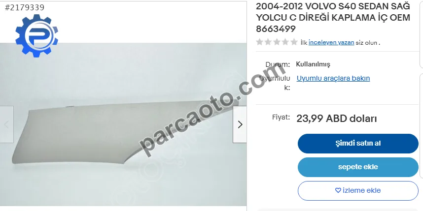 Volvo S40 2003-2012 modelleri için kapı arayan kullanıcılar için bu parça orijinal ve sağlam durumda olarak listelenmektedir. Çıkma parçalar, sıfır parçalara göre daha uygun fiyatlı olup orijinal üretici kalitesini korur. Hatay adresinde bulunan satıcıdan temin edilebilir.